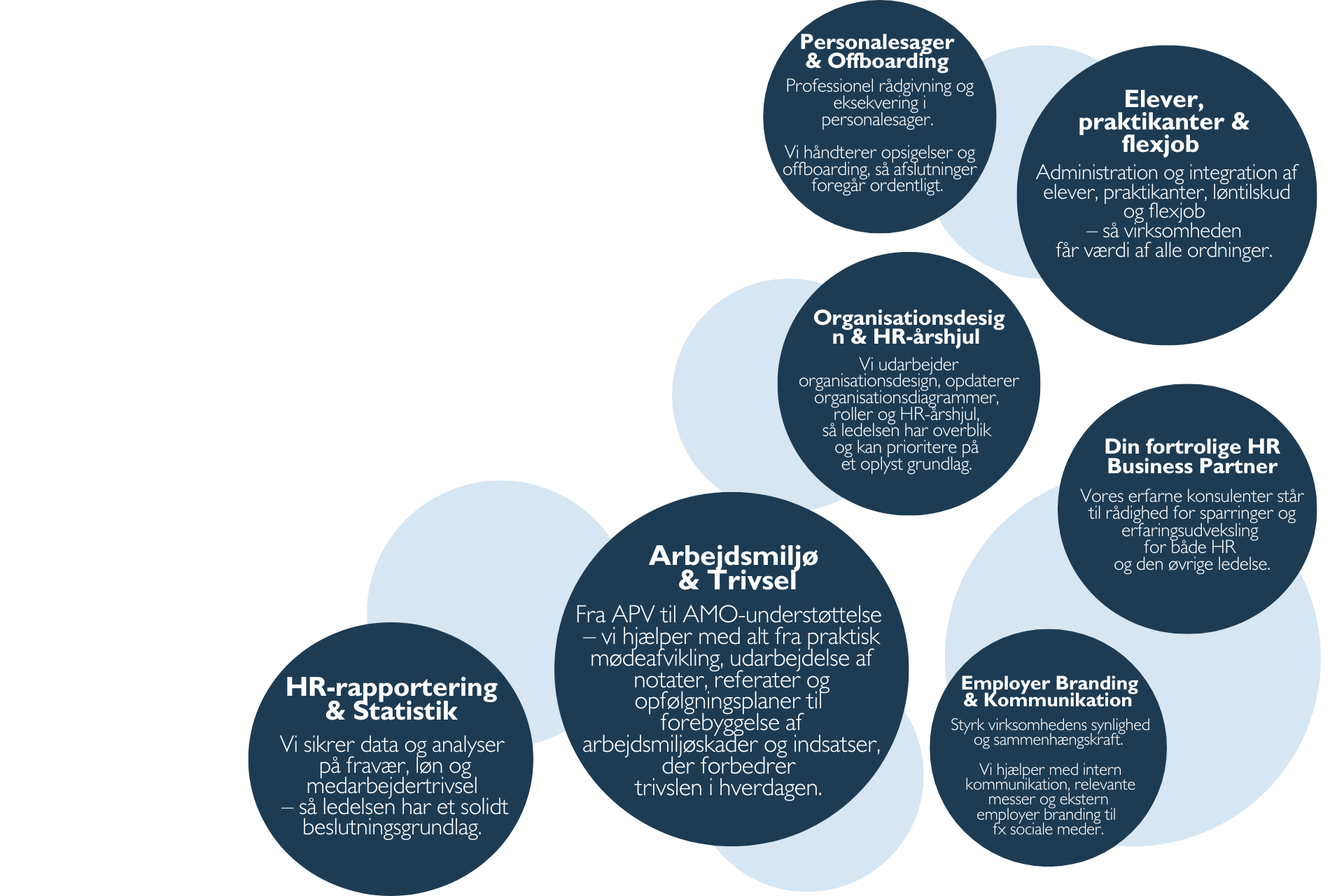 Ferieplanlægning, restferie, rådgivning i ferieloven, barselsplaner, sygefraværsassistance og refusionsansøgninger.